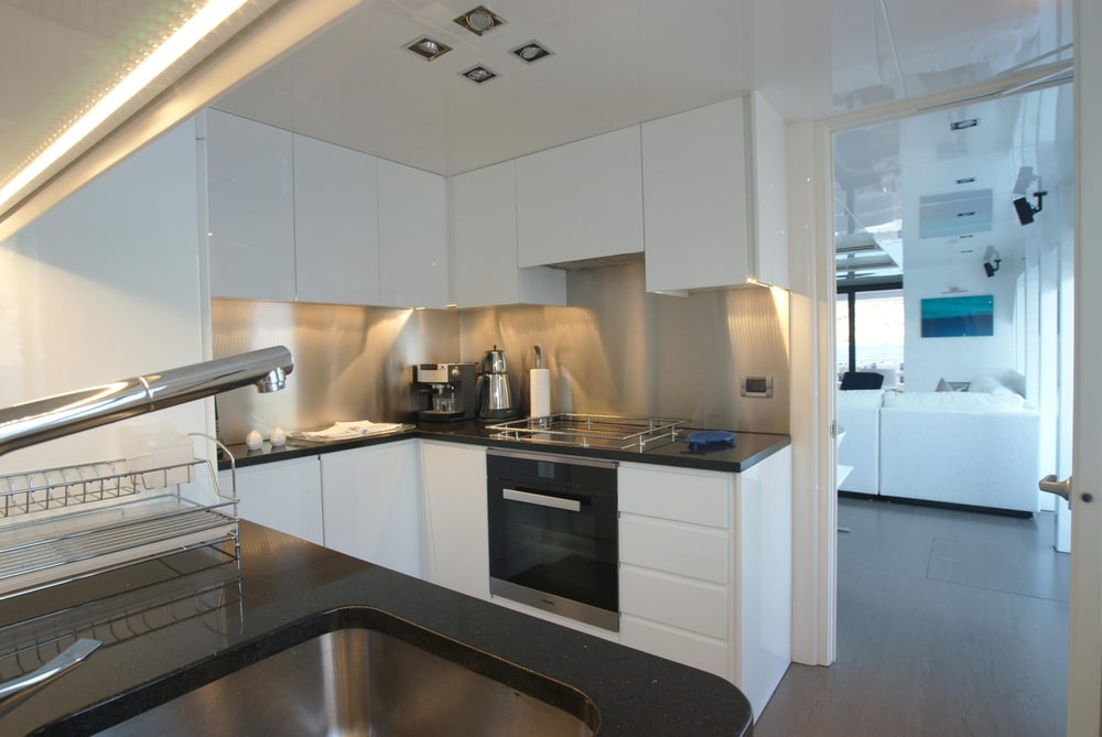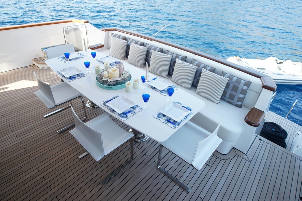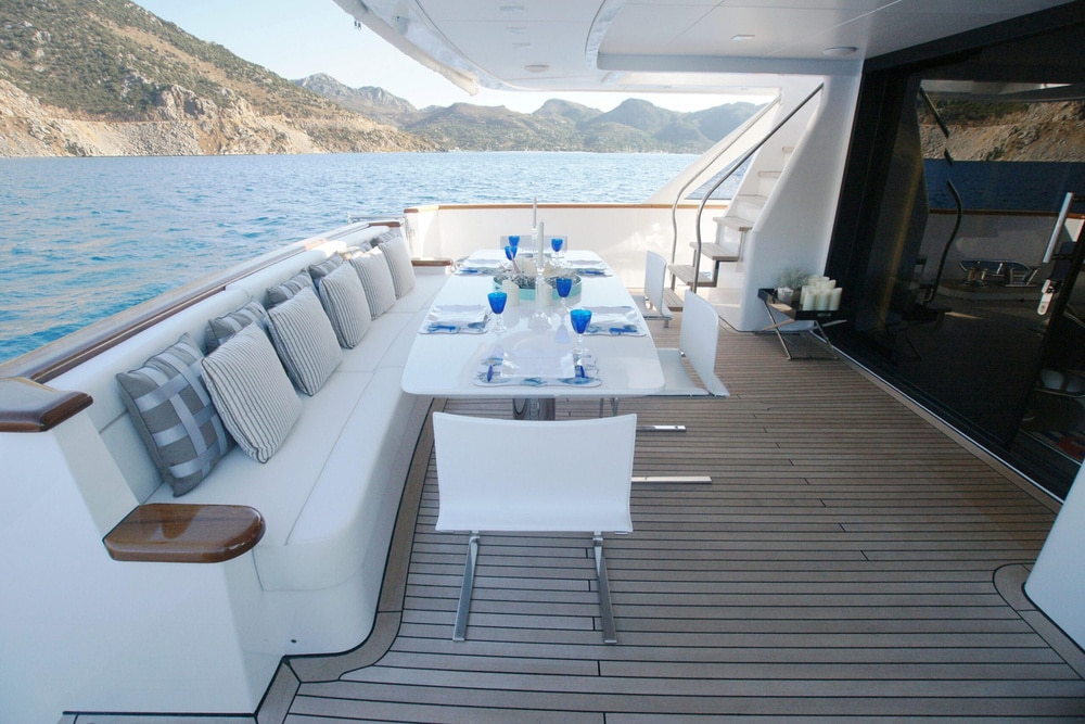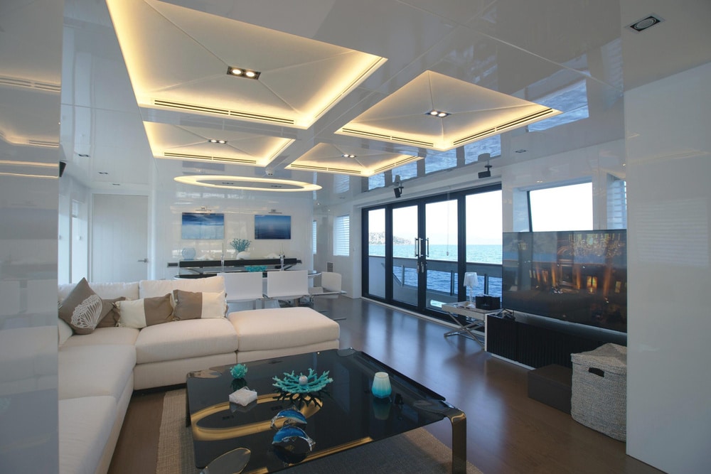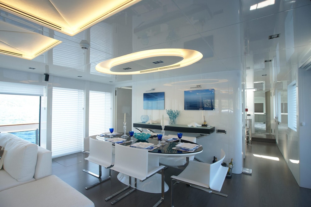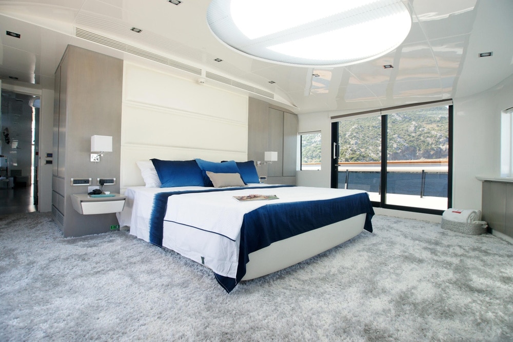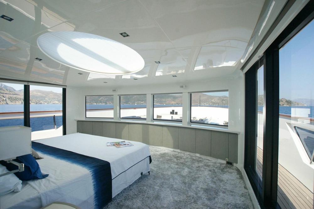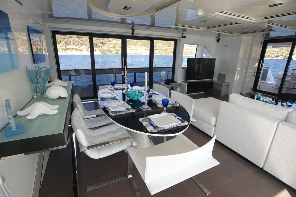 Moving indoors, you are greeted with a light, elegant interior that really gives an impression of sophistication as well as clean spaces. Surrounded by full length windows and sliding doors both sides, the main deck saloon is a very welcoming area to relax and still feel attached to the amazing views outdoors. You will also find the main indoor dining table here where meals can be served if the weather turns. Continuing forward through the main deck, you will come to the master suite and it’s impressive panoramic windows. With sliding glass doors allowing private access to the foredeck, and a large retractable sky light, this really is a stunning master suite for your primary client to be blown away by. Venturing down to the lower deck, you will find 2 VIP staterooms, as well as 2 twin staterooms for the remaining guests to enjoy. All are en suite with fantastic outdoor views throughout.
