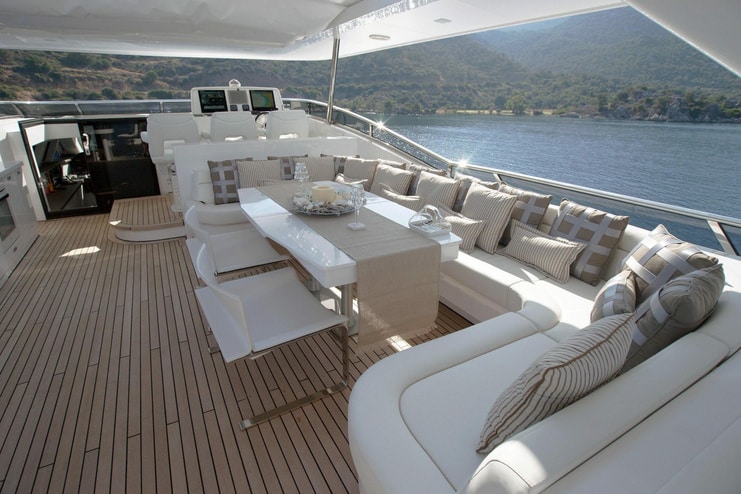 Up top, you will find a large sundeck including a generous dining space with a separate shaded bar, as well as a sun-lounging area for those wanting to enjoy the glorious weather. The foredeck offers further sun-lounging and seating spaces, with private access to the master suite. The main deck is also generous, with sofas and a full sized outdoor table for dining.