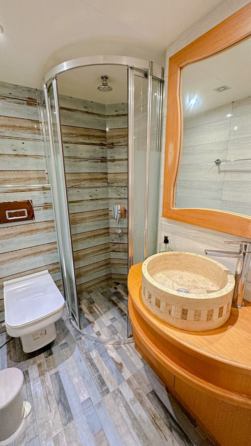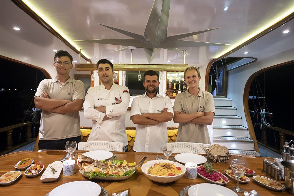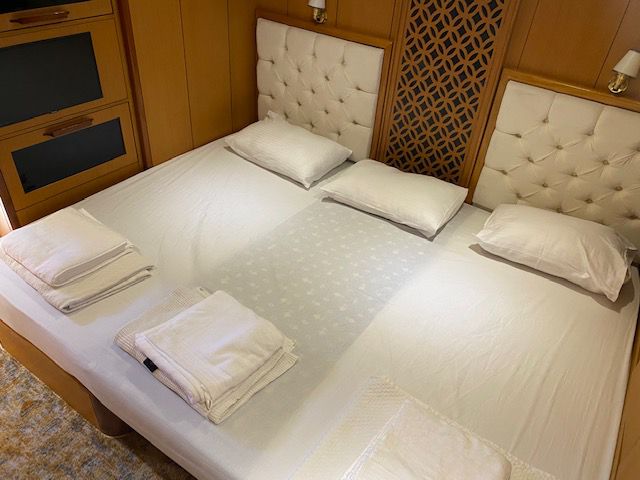 Experienced crew of 4 will provide you with the service you expect. There are 2 master cabins and 2 twin cabins. The cabins are stylish, comfortable and luxury class. The beds in the twin cabins are optionally combined and can be made into double beds. The kitchen also has a section and the crew cabin is on the separate side.