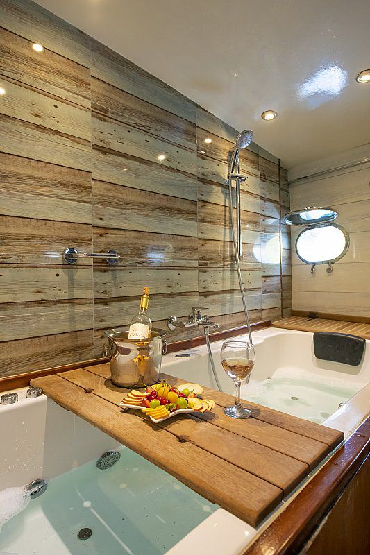 The jacuzzi in the aft master cabin of Gulet Blu Dream adds a special feature. In the front area, there are sunbathing mats for 8 guests and a seating group for 4 people. The aft deck area has ample seating and a main dining area. The crew service bar creates the ideal space for quick service to guests. In the flybridge area, there is a small table and the bridge. With her wide inventory of water sports, this beautiful Blu Dream gulet offers a fun, enjoyable and luxurious gulet cruising tours.