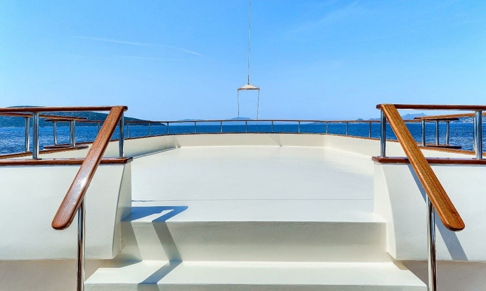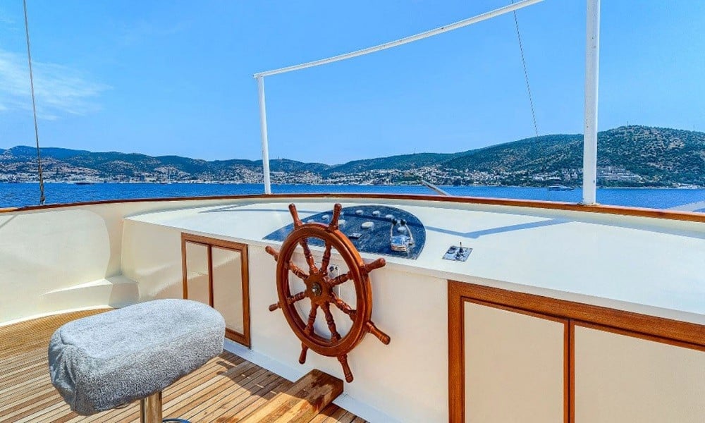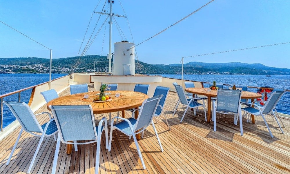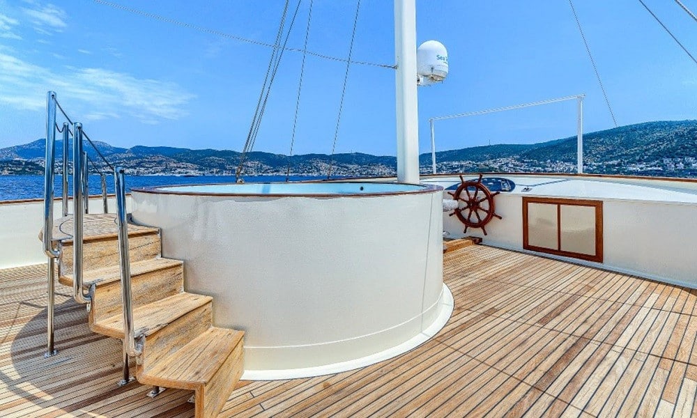 Most entertaining part of the Elara 1 yacht is undoubtedly the upper deck. The jacuzzi, sunbathing areas, service bar and seating groups in the upper deck area provide a unique party opportunity for the guests.
