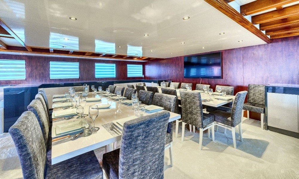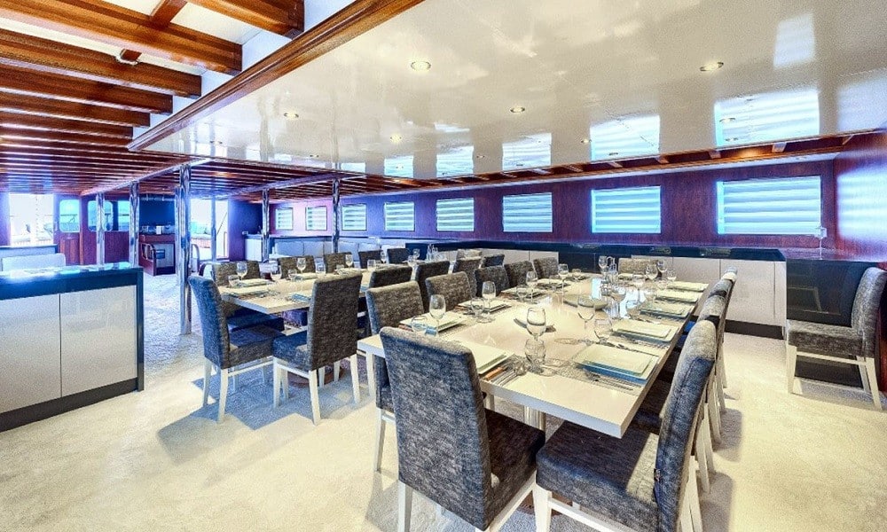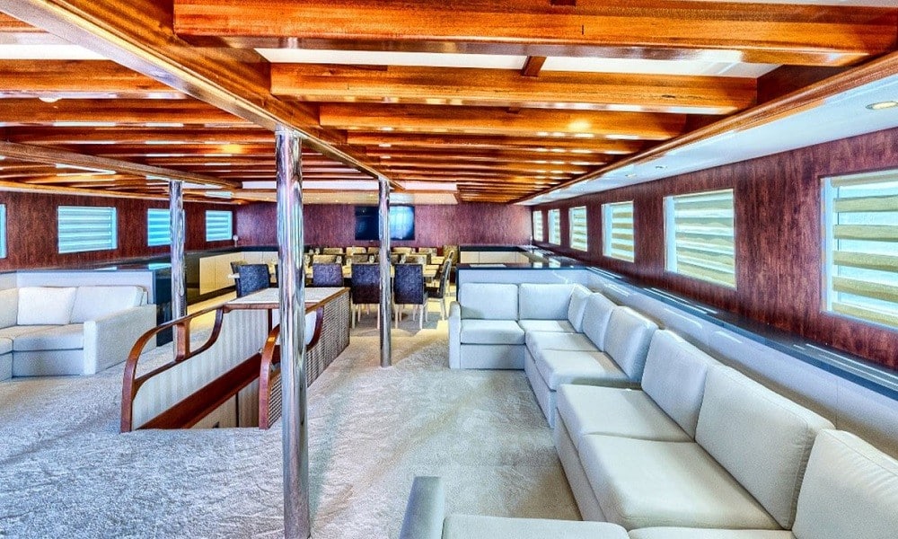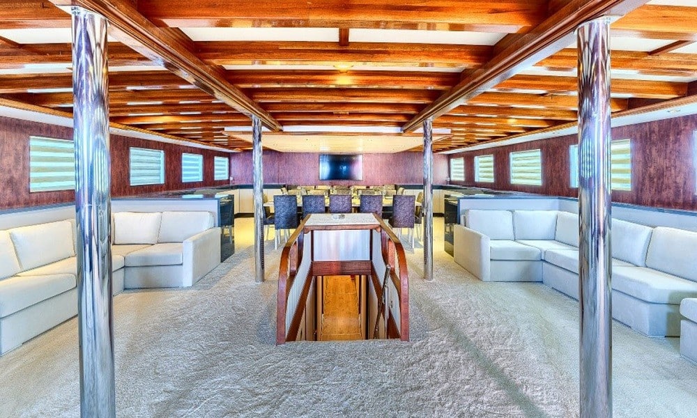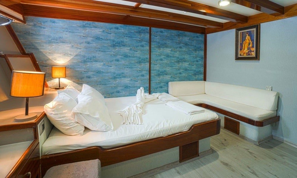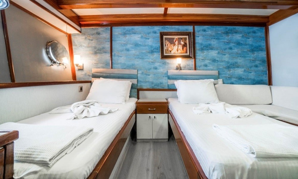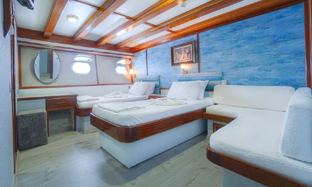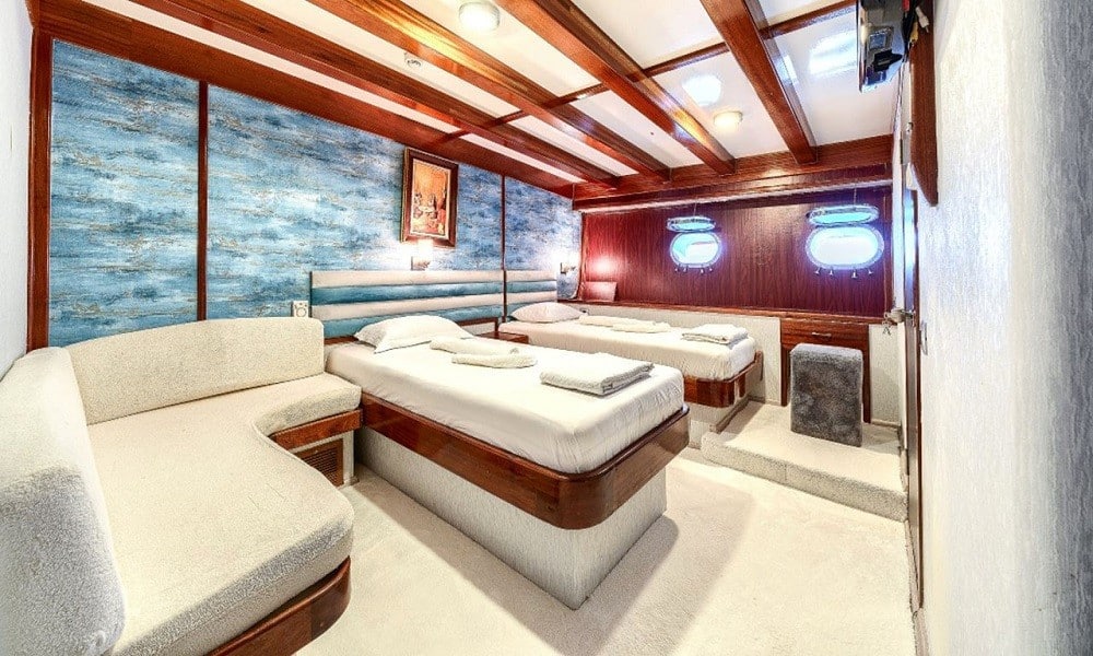 She provides 12 refurbished cabins and accommodation capacity for up to 24 guests. Cabins are spacious and luxuriously comfortable. Each cabin has a bed, shower, WC, shower cabin, air conditioner, make-up table, small sitting area, wardrobe, among her standards.