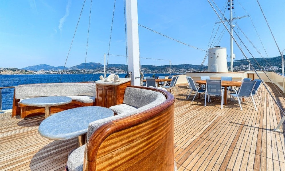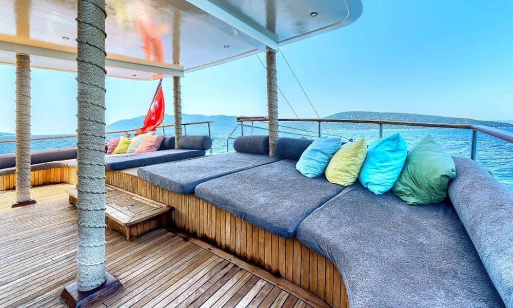 Front deck also has a wonderful seating area where you can toast to the unique panoramic view. Independent and different, comfortable seating areas on Elara 1 gulet offer you beautiful alternatives with your group, friends or family.