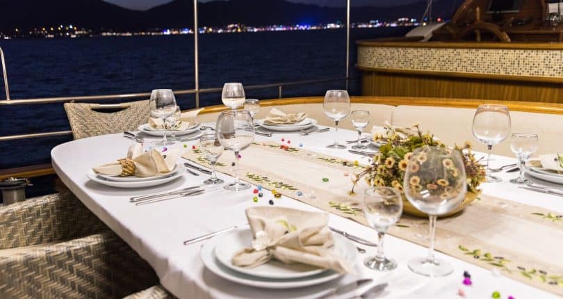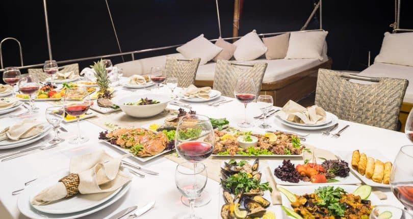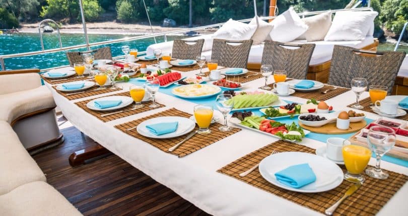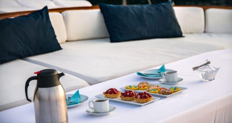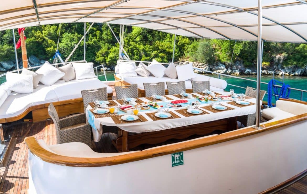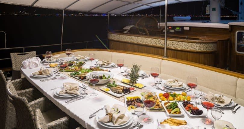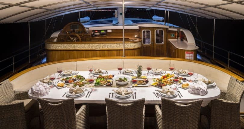The shaded aft is furnished with oversized cushions bordering the stern, while many memorable social gatherings and savory Mediterranean dishes can be experienced alfresco around a large oval wooden table made from mahogany, surrounded by teak chairs. There is also a full service bar from where guests can enjoy cool and refreshing drinks during their travels on board S. Nur Taylan. The dishes are superb. Turkish Mediterranean, with a wide assortment that appeals to many palettes – prepared fresh and daily.