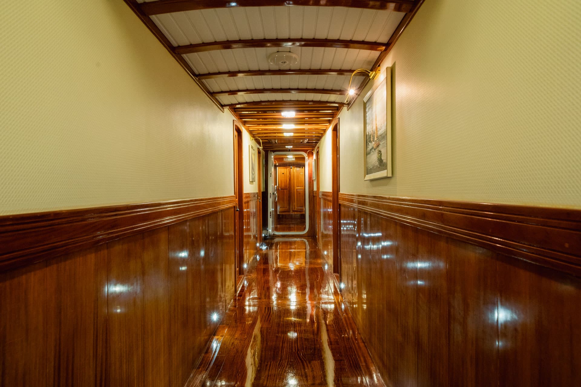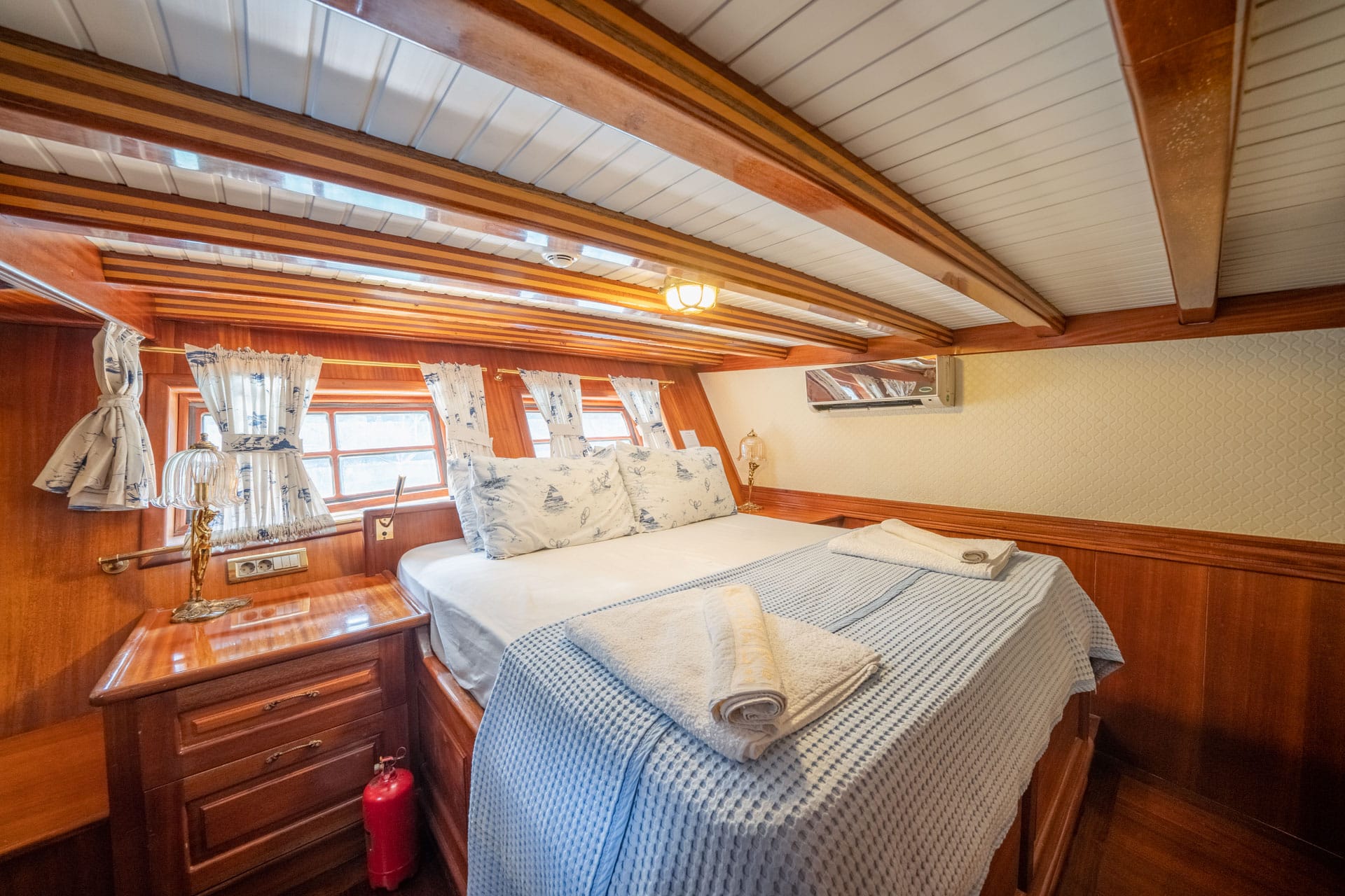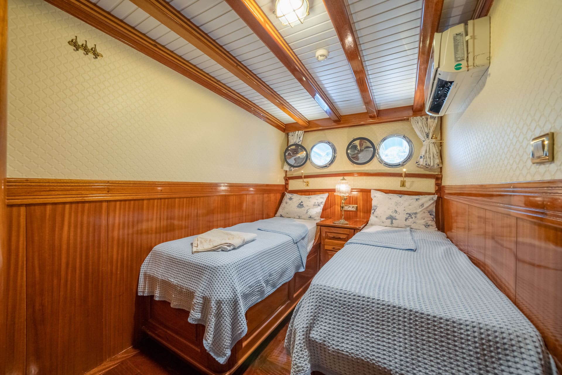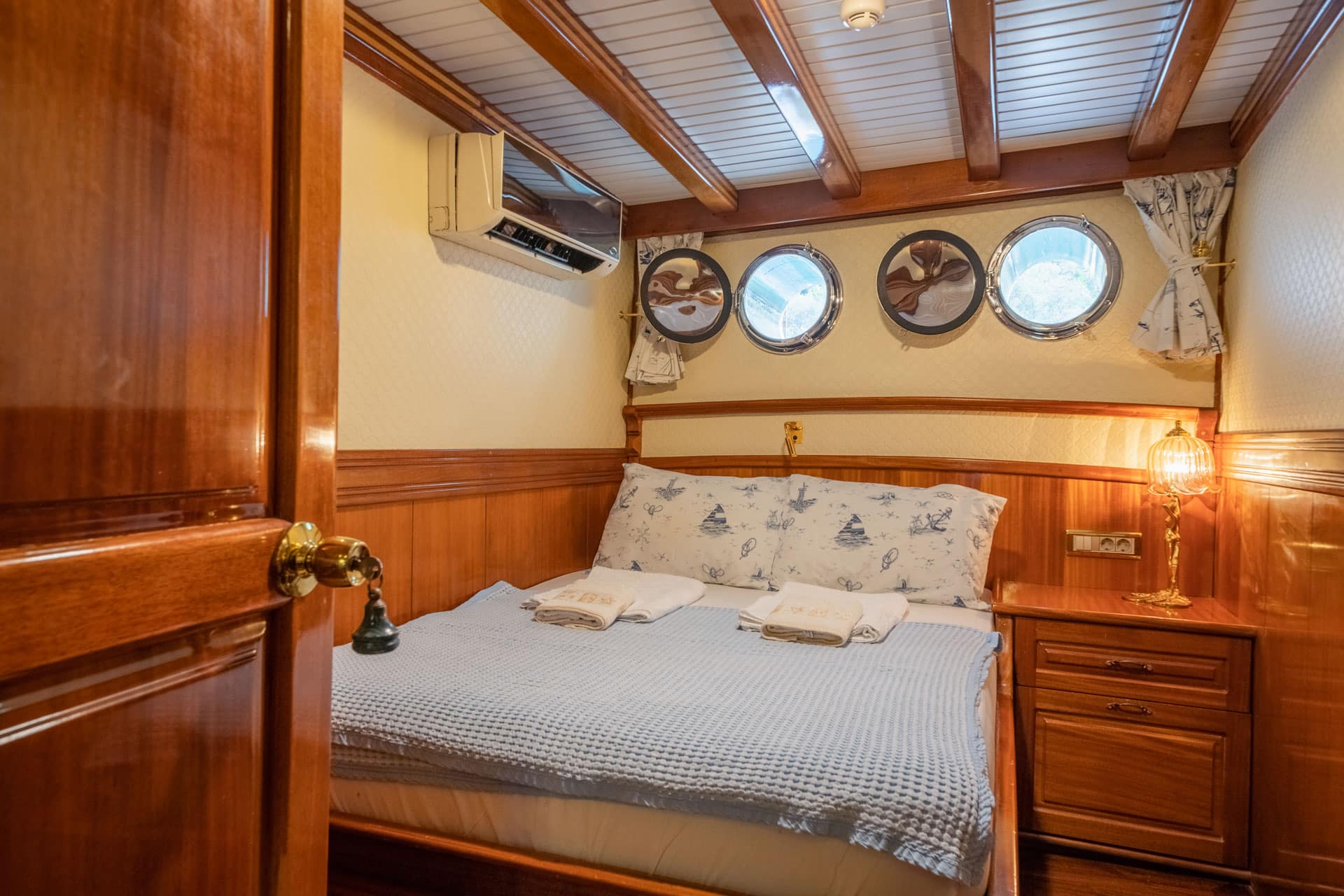 Our yacht has 16 cabins, 10 Double Cabins, 4 Triple Cabins, 2 Twin Cabins, each more stylish and comfortable than the other, with its own shower, WC and air conditioning.