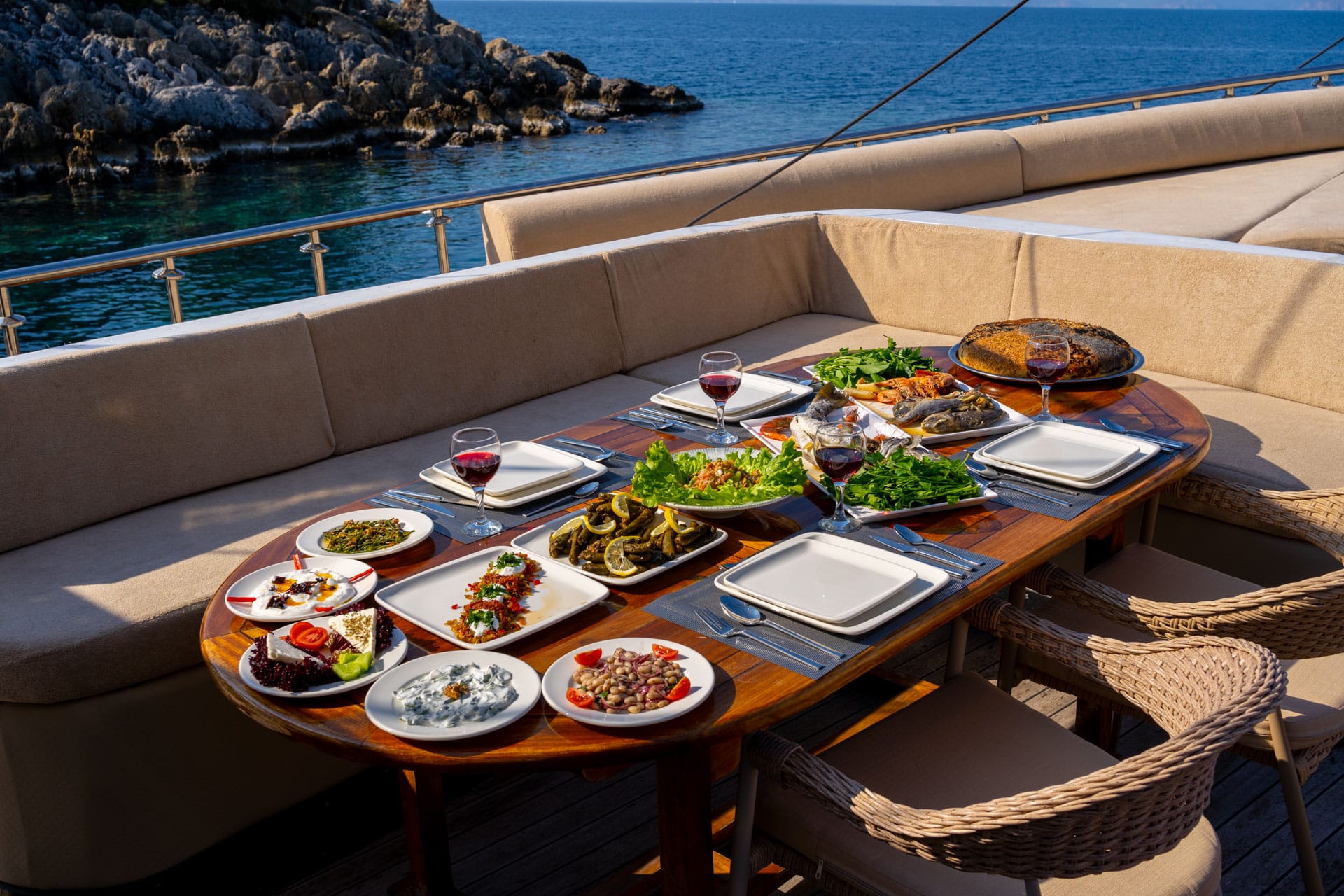There are separate living areas for the crew, a fully equipped kitchen, indoor and outdoor dining areas, and rest areas. There are enough sunbathing mats, chairs and service sets for all guests.