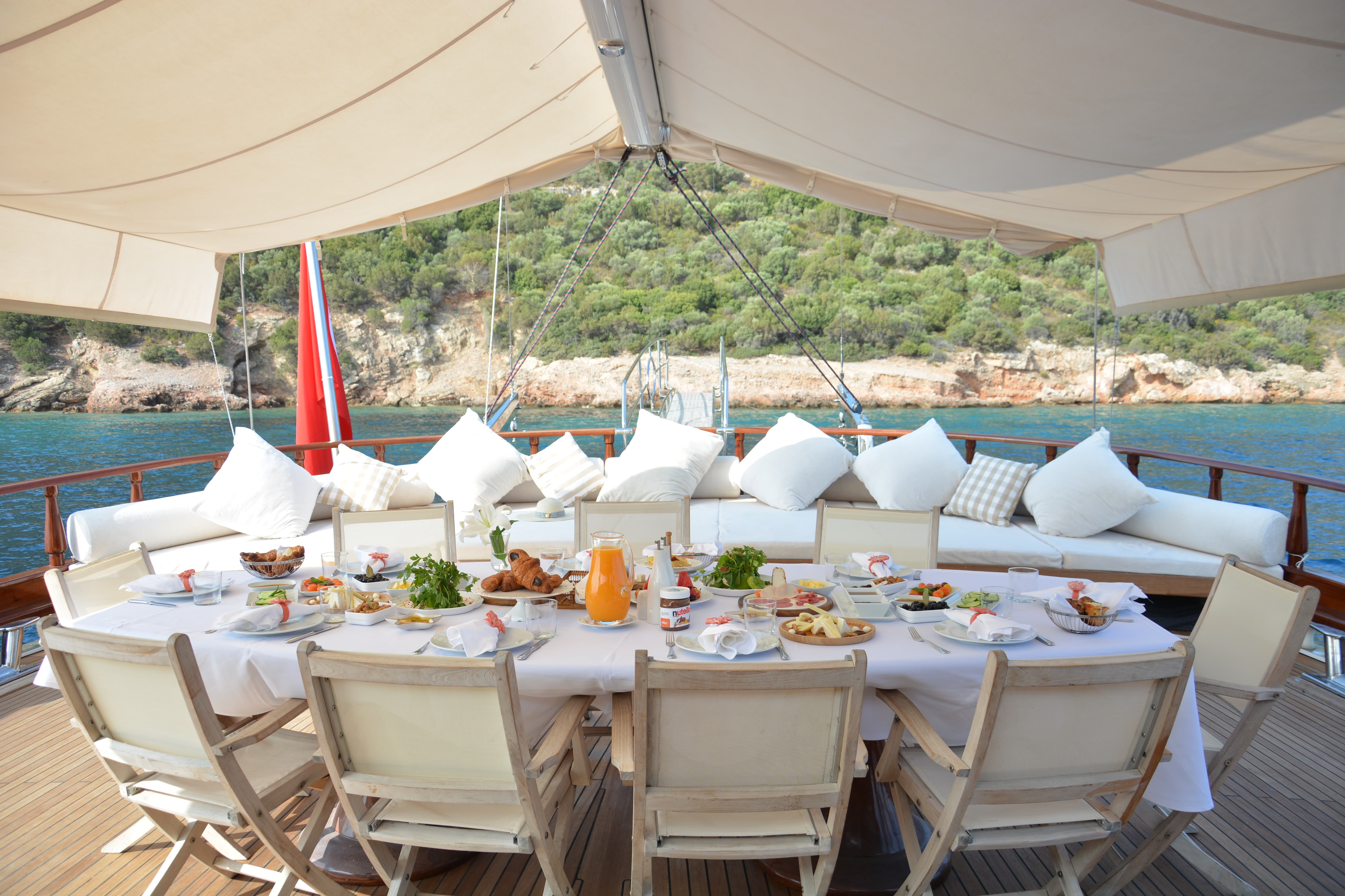 Our trendy, beautifully designed gulet has a wide range of applications. There are plenty of sunbathing cushions and wide, comfy resting couches on the deck. You can sample the excellent meals prepared carefully and precisely in our fully equipped kitchen at our beautiful table on the aft deck. We provide a unique and spectacular blue cruise experience in Europe.