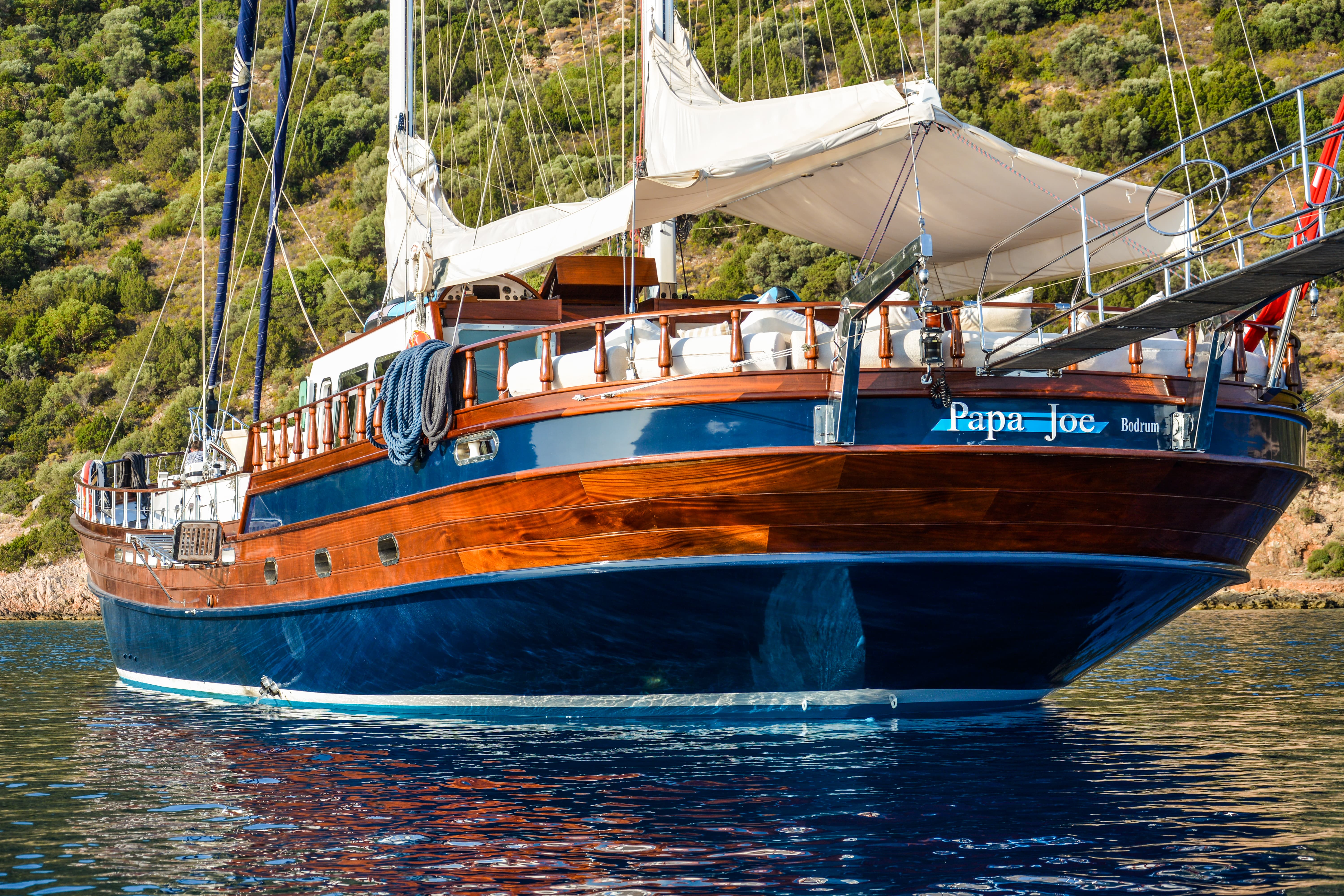 Gulet Papa Joe was created in 2007 and is 34 meters long and 8.20 meters wide. Our luxurious gulet, which was restored in 2011, can accommodate up to ten guests in total, with one master cabin and four double cabins. All of our cabins are huge and roomy, with everything you need, including a TV, DVD, music system, air conditioning, shower, and WC. Our team has its own living quarters and will assist you professionally to meet your every requirement.